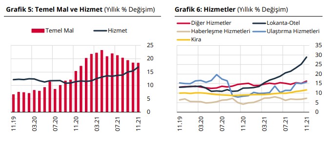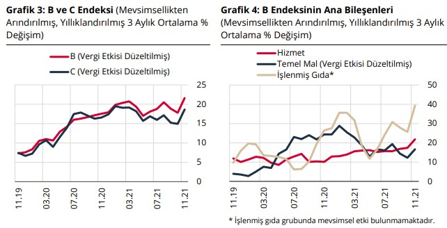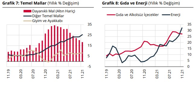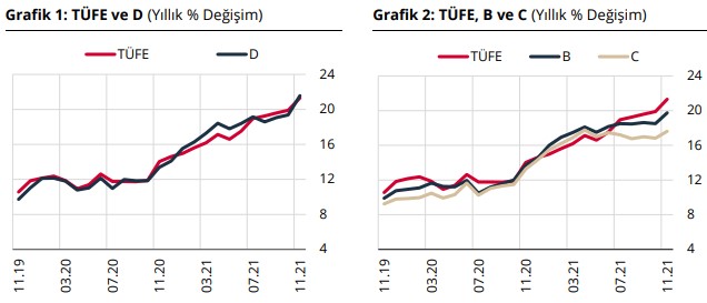 Tüketici fiyatları Kasım ayında yüzde 3,51 oranında artmış, yıllık enflasyon 1,42 puan yükselişle yüzde 21,31 olmuştur. Enflasyondaki yükselişe en belirgin katkı enerji grubundan gelmiştir. Uluslararası enerji fiyatlarında bu dönemde bir miktar gevşeme görülürken Türk lirasındaki görünümle başta akaryakıt, tüp gaz ve kömür olmak üzere yurt içi enerji fiyatları artış kaydetmiştir. Enflasyondaki yükselişte öne çıkan bir diğer grup hizmet sektörü olurken, bu grupta lokanta-otel grubu fiyatlarındaki hızlanma belirgin olmuştur. Taze meyve ve sebze dışı gıda enflasyonundaki seyir yemek hizmetleri enflasyonunu olumsuz yönde etkilemektedir. Kasım ayında küresel gıda ve tarımsal emtia fiyatlarındaki yükseliş eğilimi tahıllar öncülüğünde sürmüş, bu gelişmenin olumsuz yansımalarına karşın, taze meyve ve sebze enflasyonundaki görünüm ve baz etkisiyle gıda yıllık enflasyonu sınırlı bir oranda gerilemiştir. Temel mal fiyatlarındaki aylık artış hızlanırken, bir önceki yılın aynı dönemindeki yüksek artış nedeniyle bu grupta yıllık enflasyon görece yatay seyretmiştir. Bu dönemde emtia fiyatlarında süregelen olumsuz seyir, tedarik zincirlerinde artarak devam eden aksamalar ve Türk lirasındaki gelişmelerle birlikte üretici fiyatlarında enerji ve ara malları başta olmak üzere genele yayılan artışlar görülmüştür. Bu görünüm altında, B ve C göstergelerinin yıllık enflasyonları ve ana eğilimleri yükselmiştir.