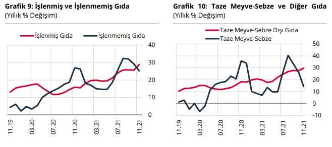 enflasyonundaki gerilemede temelde taze meyve-sebze fiyatları etkili olurken, mevsimsellikten arındırılmış veriler Eylül ayından bu yana taze meyve-sebze grubunda gözlenen düzeltmenin sebze kaynaklı olarak bu dönemde de devam ettiğine işaret etmiştir (Grafik 10). Bu dönemde, diğer işlenmemiş gıda grubu genelinde fiyatlar önemli ölçüde yükselirken (yüzde 5,47); et, yumurta, patates, kuruyemiş ve bakliyat fiyatlarındaki artışlar öne çıkmıştır. Bu gelişmelerde tarımsal kuraklık, kur gelişmeleri ve girdi maliyetleri etkili olmaya devam etmiştir. İşlenmiş gıdada aylık fiyat artışı hızlanırken (yüzde 4,83); bu dönemde genele yayılan yüksek artışlar görülmekle birlikte özellikle tarımsal kuraklık ve uluslararası tahıl fiyatlarında gözlenen olumsuz seyir ile kur gelişmelerinin yansımalarının hissedildiği ekmek ve tahıllar grubundaki aylık yükseliş (yüzde 7,20) dikkat çekmiştir. Ayrıca, kırmızı et fiyatlarındaki artışların etkilerinin izlendiği işlenmiş et ürünleri, uluslararası yağ fiyatlarının etkilerinin görüldüğü katı-sıvı yağlar ile şeker ve şekerle bağlantılı ürün grupları öne çıkmıştır. Bu gelişmeler sonucunda, taze meyve ve sebze dışı gıda grubunda yıllık enflasyon 2,23 puan yükselerek yüzde 29,76’ya ulaşmıştır (Grafik 10).