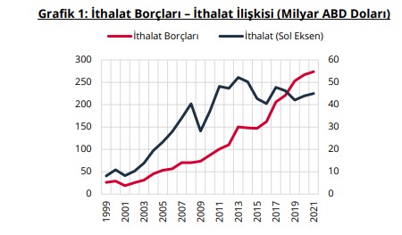 Dış borç istatistiklerini etkileyen başlıca revizyon ticari kredilerin firmalardan doğrudan raporlama yoluyla derlenmesi olmuştur. Firmaların dış ticaretten kaynaklı ihracat alacakları ve ithalat borçları daha önce gümrük beyannameleri esas alınarak belirli varsayımlar altında borç istatistiklerine yansıtılmaktaydı. Ancak Türkiye’nin ithalatı ve vadeli ithalatında yapısal bir değişiklik olmamasına rağmen son yıllarda ithalat borçlarında dikkat çekici bir artış gözlenmiştir (Grafik 1).