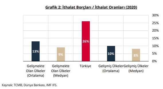 Diğer taraftan ülkelerin ticari kredi yükümlülükleri kıyaslandığında da, gelişmiş ve gelişmekte olan ülkelerin “İthalat Borçları/İthalat” oranlarının ortalama ve medyan değerlerine kıyasla, Türkiye’nin oranının görece yüksek olduğu gözlenmektedir (Grafik 2). Gelişmekte olan ülkelerin 2020 yılı ortalaması %13 ve medyan değerleri %9 düzeyinde iken, gelişmiş ülkelerin aynı oranları sırasıyla %10 ve %8 düzeyindedir. Türkiye’nin bu dönemdeki ithalat borçlarının ithalata oranı ise %26 düzeyindedir.