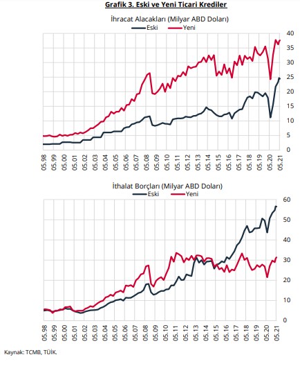 Doğrudan raporlama yöntemi ile elde edilen ticari kredi borç ve alacak verileri öncelikle tam kapsayıcılık sağlayacak şekilde tümevarım yöntemiyle genişletilmiş, daha sonra da girdi oluşturdukları istatistiklere geriye dönük olarak yansıtılabilmeleri için geçmiş zaman serileri üretilmiştir (Grafik 3). Buna göre; 2021 Mayıs ayı itibarıyla ihracat alacakları 13,1 milyar ABD doları artarak 24,5 milyar ABD dolarından 37,6 milyar ABD dolarına, İthalat borçları ise 25,1 milyar ABD doları azalarak 56,5 milyar ABD dolarından 31,4 milyar ABD dolarına gerilemiştir.