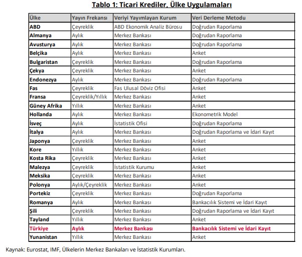 Ticari krediler istatistiklerindeki söz konusu yanlılıkların düzeltilmesi amacıyla 2020 yılında TCMBTÜİK iş birliğinde, birçok ülkede yaygın olarak kullanılan (Tablo 1) doğrudan raporlama tekniği ile firma seviyesinde veri derlenmesine yönelik bir çalışma başlatılmıştır. Çalışma ile çeyreklik dönemler itibarıyla toplam vadeli ithalatın ve ihracatın en az yüzde seksenini temsil eden firmalardan ticari alacak ve borçlarını yurt içi – yurt dışı ayrımında, yabancı para kompozisyonlarını da içerecek şekilde