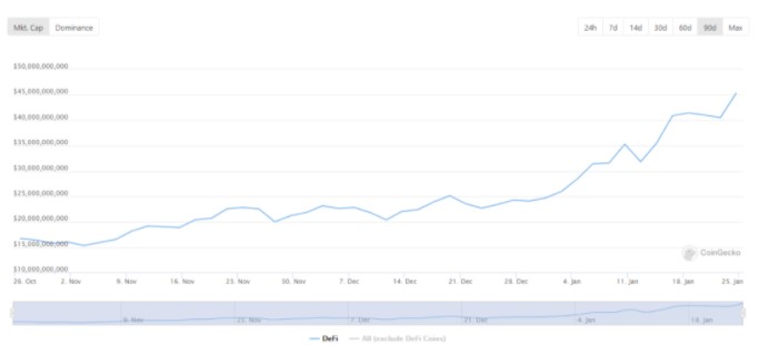 Bitcoin (BTC) ve Ether (ETH) fiyatı son aylarda yeni zirvelere ulaşırken, DeFi protokollerindeki kilitli toplam değer (TVL) de yükseldi. Çeşitli merkeziyetsiz borsalar ve kredi platformları üzerindeki iyimserlik ve katılım miktarı arttı. CoinGecko'dan alınan veriler, son altı ayda toplam DeFi piyasa değerinin 45 milyar dolara yükseldiğini gösteriyor.