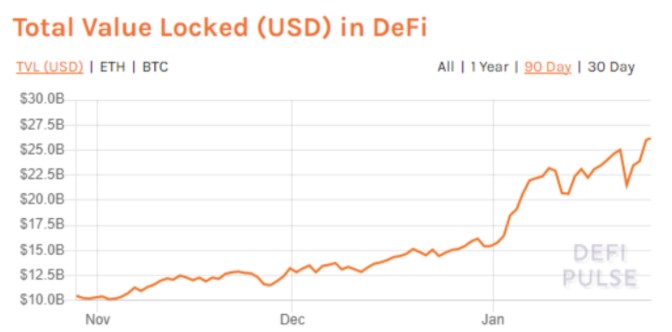 1 Ocak'tan 25 Ocak'a kadar, DeFi platformlarındaki kilitli varlık miktarı 15,6 milyar dolardan 26,1 milyar dolara yükseldi.