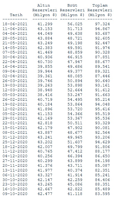 Merkez Bankası verilerine göre, bir önceki hafta 51 milyar 713 milyon dolar olan rezervler, 18 Haziran ile sona eren haftada 56 milyar 25 milyon dolara geldi.