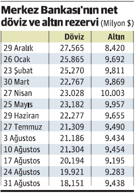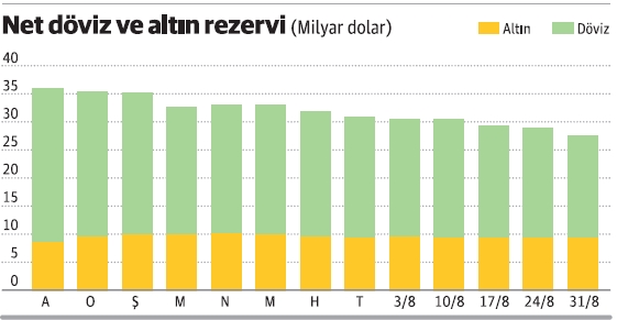 Merkez Bankası’nın döviz ve altından oluşan net rezervi geçen yıl sonunda 36 milyar dolar düzeyinde bulunuyordu. Net rezerv 31 Ağustos’ta 27.6 milyar dolara geriledi.