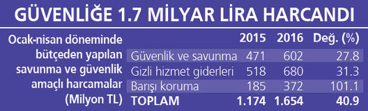 Terörle mücadele dolayısıyla güvenlik ve savunmaya yönelik harcamalar dört aylık dönem itibarıyla yüzde 28 artışla 602 milyon liraya ulaştı. Barışı destekleme ve koruma harekâtı gideri, geçen yılın tamamında 367 milyon lira iken, bu yılın dört ayında 372 milyon lira oldu. Örtülü ödeneği de içeren “gizli hizmet giderleri” yüzde 31 arttı.
