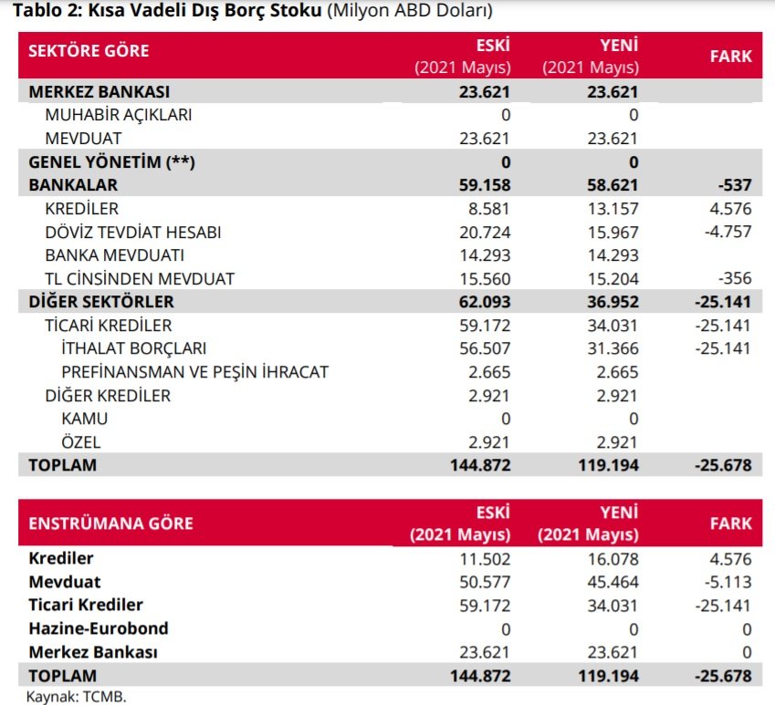Bilgi notuna göre, üç başlık altında gerçekleştirilen revizyonlar sonrası Mayıs 2021 itibarıyla kısa vadeli dış borç 25,7 milyar dolar azalarak 144,9 milyar dolardan 119,2 milyar dolara geriledi.