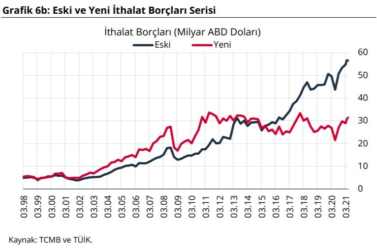 İthalat borçlarının ithalata oranının ortalama ve medyan değerlerinin gelişmiş ve gelişmekte olan ülkelere kıyasla Türkiye'de görece yüksek olduğu vurgulanan notta, "Gelişmekte olan ülkelerin 2020 ortalaması yüzde 13 ve medyan değerleri yüzde 9 düzeyinde iken, gelişmiş ülkelerin aynı oranları sırasıyla yüzde 10 ve yüzde 8 düzeyindedir. Türkiye'nin bu dönemdeki ithalat borçlarının ithalata oranı ise yüzde 26 düzeyindedir." denildi.