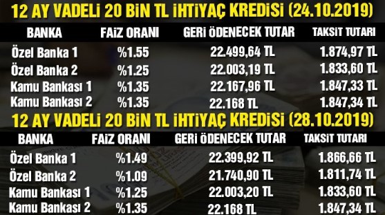 sozcu.com.tr’nin 2 kamu ve 2 özel bankanın kredi hesaplama sisteminden derlediği bilgilere göre, aynı miktar ve vade süresiyle 12 Aralık Perşembe günü hesaplanan kredilerle, 17 Aralık Salı günü hesaplanan kredilerin faiz oranları, toplam geri ödeme miktarı ve aylık taksit tutarında herhangi bir değişiklik olmadı.