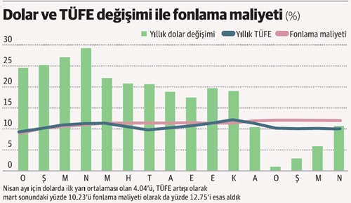 Dolardaki yıllık artış geçen yıl enflasyonun da, ortalama fonlama maliyetinin de çok üstünde seyrediyordu. Aradaki makas kapandı ve geçen yılın aralık ayı itibarıyla kur artışındaki değişim enflasyonun ve fonlama maliyetinin altında kaldı. Enflasyon-kur değişimi nisanda yeniden eşitlendi.