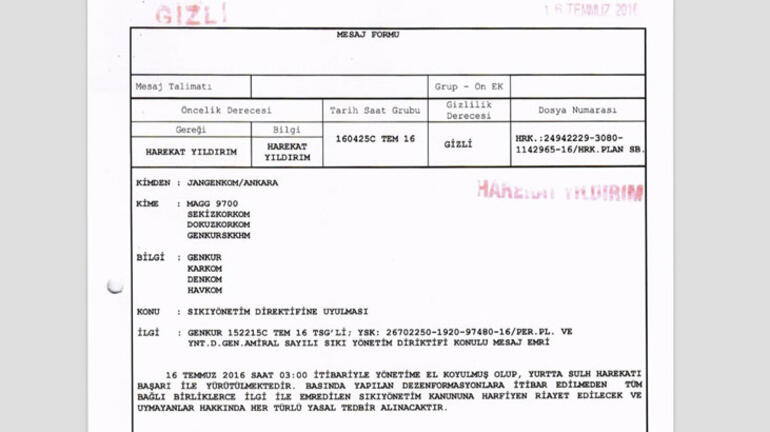 "Harekat yıldırım" kodlu olan ve sözde sıkıyönetim emirlerine uymayanlar hakkında yasal işlem yapılacağı belirtilen mesaj, 04.25'te bağlı birliklere gönderildi.