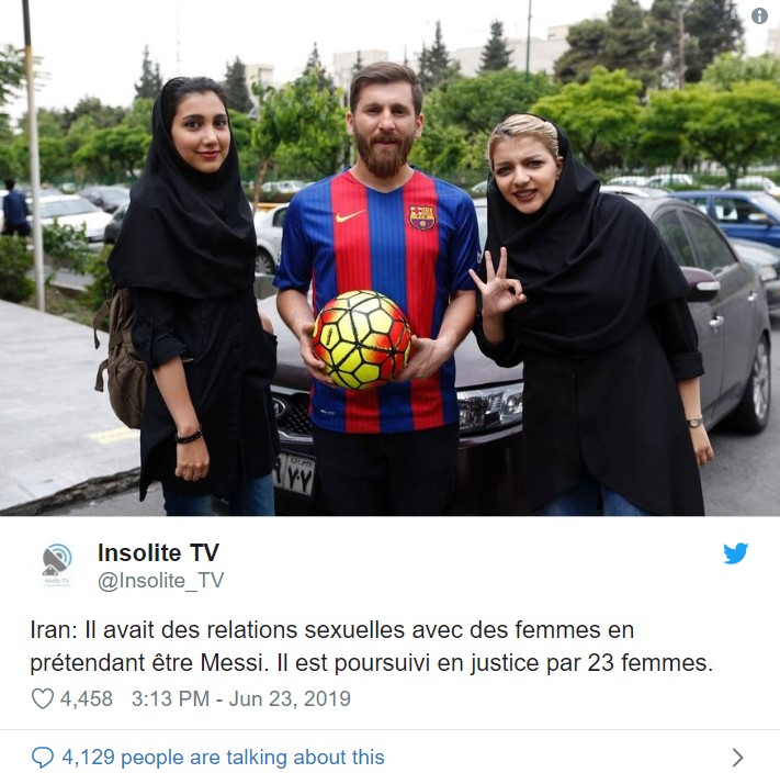 Insolite TV'nin aktardığı habere göre İran'da yaşayan Rıza Parastesh, Barcelona'nın Arjantinli yıldız futbolcusu Lionel Messi'yle olan benzerliğini kullanarak, 23 kadınla ilişkiye girdi.