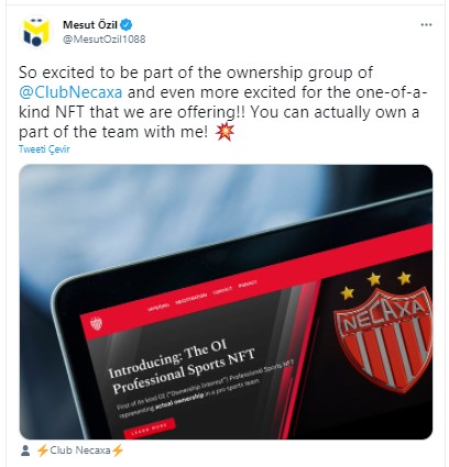 Satın alma işlemini Twitter hesabından duyuran Özil, "Necaxa'nın sahiplik grubunun bir parçası olmaktan dolayı çok heyecanlı olmakla birlikte, türünün tek örneği olarak sunduğumuz NFT için daha heyecanlıyım. Benimle takımın bir parçasına sahip olabilirsin" ifadelerini kullandı.