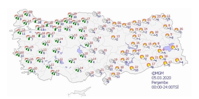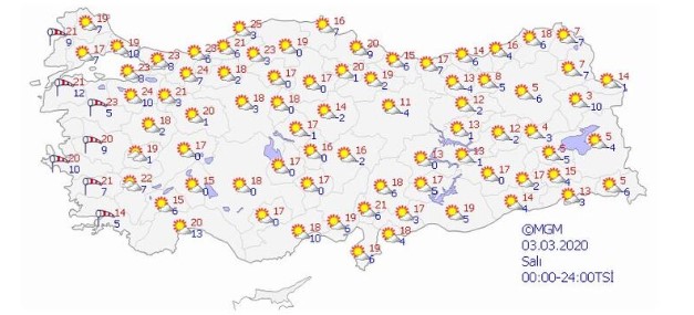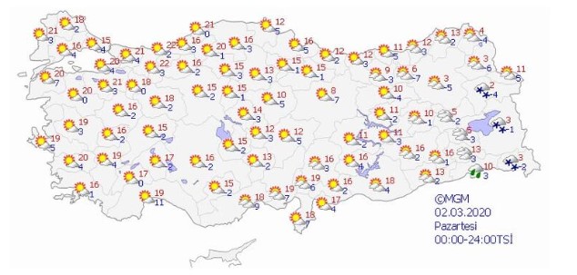 Yeni haftanın ilk gününde yurdun büyük kısmında bol güneşli bir hava olacak. Doğu Anadolu’nun doğu kesimlerinde Van, Hakkari, Ardahan çevrelerinde kar ihtimali bulunuyor. Fakat bu yağışlar salı günü kesilmiş olacak. Sıcaklıklar ise haftanın ilk gününden itibaren artışa geçiyor. Sıcaklıklar Marmara’da 20 derecenin üzerine çıkacak, Ege ve Akdeniz’de 20 dereceleri bulacak. Karadeniz’in orta kesimlerinde de yer yer sıcaklıklar 19-20 dereceye çıkabilecek.