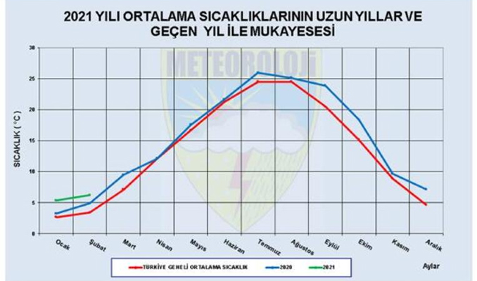Meteoroloji Genel Müdürlüğü'nce, 2021 yılı şubat ayı ortalama sıcaklıklarının, 1981- 2010 normallerine göre mukayesesini içeren analizi hazırlandı. 2021 yılı Şubat ayında ortalama sıcaklıklar Sakarya, Bursa, Balıkesir, Lüleburgaz, Akhisar, Beyşehir, Antakya, Göksun, Elmalı, İç Anadolu bölgesi geneli, Bolu, Kastamonu, Karabük, Merzifon, Amasya, Tokat, Gümüşhane, Boyabat, Nallıhan, Zile, Bitlis, Divriği, Muradiye, Elbistan çevrelerinde mevsim normalleri civarında seyretti. Ortalama sıcaklıklar, yurdun diğer bölgelerinde mevsim normallerinin üzerinde gerçekleşti.