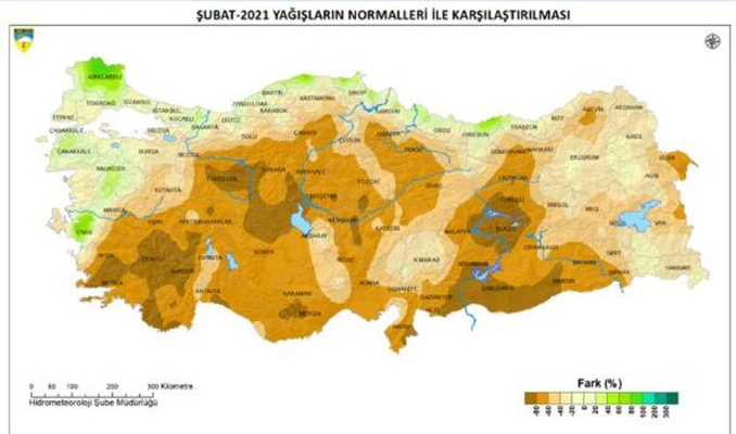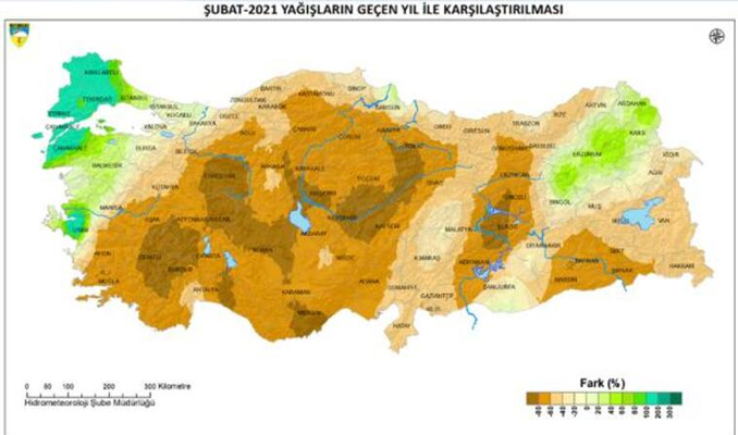 Meteoroloji Genel Müdürlüğü'nün 2021 yılı Şubat ayı alansal yağış değerlendirmesine göre ise Türkiye geneli Şubat ayı yağışları ve normali, geçen yıl yağışlarının altında gerçekleşti. Bu Şubat yağışı 32.9 mm ölçülürken, normali (1981-2010) 61.8 mm ve 2020 yılı Şubat ayı yağışının 76.9 mm olduğu açıklandı. Yağışlarda normaline göre yüzde 47, 2020 yılı Şubat ayı yağışlarına göre yüzde 57 azalma meydana geldi.