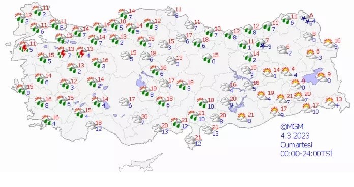 Sabah saatlerinden bu yana 4 Mart Cumartesi hava durumu da araştırılmaya başlandı. Meteoroloji Genel Müdürlüğü tarafından yapılan son değerlendirmelere göre; ülkemiz genelinin parçalı ve çok bulutlu, bu akşam ve gece saatlerinde Orta ve Doğu Karadeniz, Doğu Anadolu'nun kuzey ve doğusu, Doğu Akdeniz'in iç kesimleri, bugün Marmara, Ege Doğu Akdeniz'in Toroslar mevkii ile Bolu, Eskişehir, Isparta ve Burdur çevrelerinin yağışlı geçeceği tahmin ediliyor.