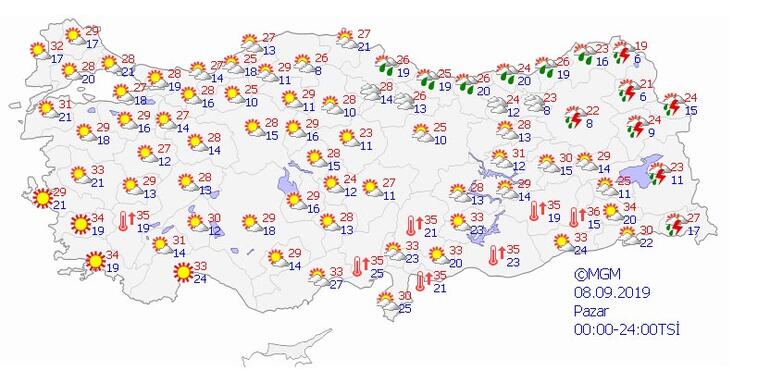 Pazar günü de özellikle Karadeniz'de sağanak yağış bekleniyor. Samsun, Ordu, Giresun, Trabzon, Rize, Artvin, Ardahan, Kars, Erzurum, Ağrı, Idğır, Van ve Hakkari'de sağanak yağış bekleniyor. Yurdun geri kalanı ise güneşli havanın etkisinde.