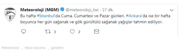 Meteoroloji Genel Müdürlüğü'nün Twitter hesabından yapılan paylaşımda, "Yurdumuz iç ve doğu bölgelerinde etkili olan sağanak yağışlara ilave olarak cuma gününden itibaren Batı bölgelerimiz üzerinde konuşlanacak olan alçak merkez ve üst seviyelerindeki soğuk hava nedeniyle bir hafta yurdun büyük bölümünde gök gürültülü sağanak yağışlar bekleniyor. Bu hafta İstanbul'da cuma, cumartesi ve pazar günleri, Ankara'da ise bir hafta boyunca her gün sağanak ve gök gürültülü sağanak yağışlar tahmin ediliyor" ifadeleri kullanıldı.