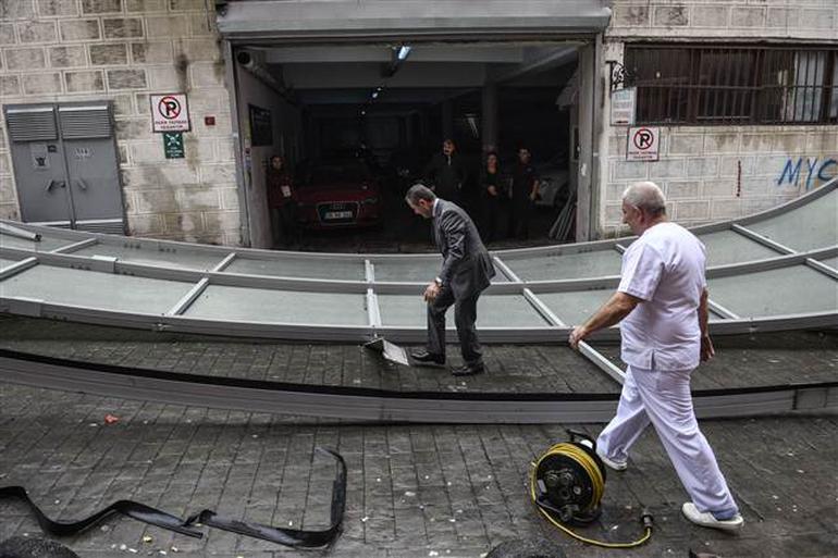 Taksim'de sağanak yağmur meydandakilere zor anlar yaşattı. Şiddetli rüzgarla birlikte Beyoğlu Öğretmenevi'nin çatısının bir bölümü uçtu.