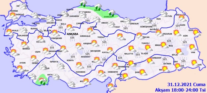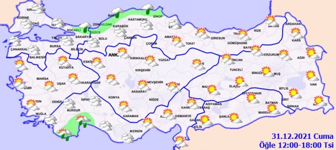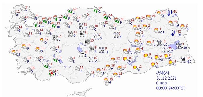 Meteoroloji Genel Müdürlüğü tarafından yapılan son değerlendirmelere göre ülkemizin kuzey, iç ve batı kesimlerinin parçalı ve çok bulutlu, Batı Akdeniz'in sağanak ve yer yer gök gürültülü sağanak yağışlı, Karadeniz kıyıları, Tokat çevreleri ile Çanakkale'nin kuzey kesimleri, Kırklareli'nin kıyı ilçeleri, İstanbul, Sakarya, Kocaeli'nin kuzey ilçelerinin yağmurlu geçeceği, diğer yerlerin parçalı ve az bulutlu geçeceği tahmin ediliyor.