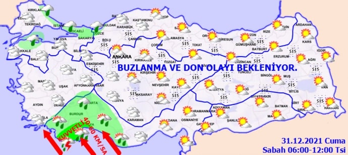 Yağışların; bu sabah saatlerinde Antalya merkez ve batı ilçelerinde yerel olarak kuvvetli olması bekleniyor. Bu sabah ve gece saatlerinde iç ve doğu bölgelerde yer yer pus ve sis ile birlikte buzlanma ve don olayı bekleniyor.