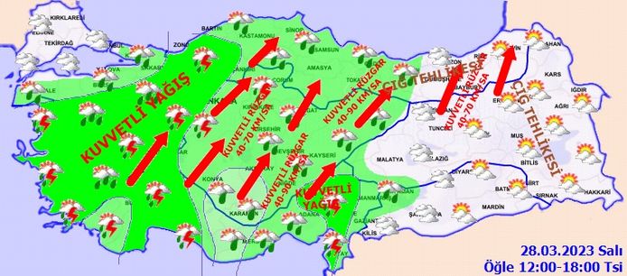 Yağışların Marmara'nın güney ve doğusu, Ege, Batı Akdeniz, Orta Karadeniz kıyıları, Adana'nın kuzey ve doğusu, Osmaniye, Hatay, Kahramanmaraş, Eskişehir, Ankara'nın kuzey ve batısı, Düzce, Zonguldak, Bolu, Karabük, Kırşehir, Nevşehir, Sivas ve Tokat çevrelerinde yer yer kuvvetli sağanak, akşam saatlerinden sonra yer yer kuvvetli kar yağışı beklendiğinden yaşanabilecek ani sel, su baskını, yıldırım, yerel dolu yağışı ve kuvvetli rüzgar, ulaşımda aksamalar gibi olumsuzluklara karşı dikkatli ve tedbirli olunması gerekmektedir.