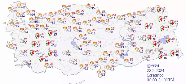 Parçalı, yer yer çok bulutlu, öğle saatlerinden sonra Eskişehir ve Konya çevreleri ile Ankara'nın güney kesimlerinin yerel olmak üzere sağanak ve gök gürültülü sağanak yağışlı geçeceği tahmin ediliyor.