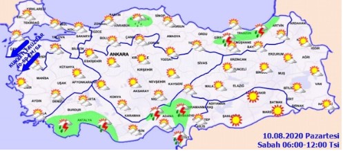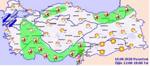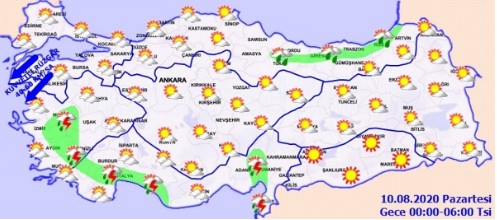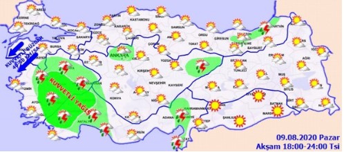 Meteoroloji Genel Müdürlüğü tarafından yapılan son değerlendirmelere göre ülkemiz genelinin parçalı ve yer yer çok bulutlu, Marmara’nın güneydoğusu, Güney Ege, Akdeniz, Manisa, Kütahya, Uşak, Afyonkarahisar, Trabzon, Rize ve Artvin çevreleri ile İzmir ve Giresun'un iç kesimlerinin yerel olmak üzere sağanak ve gök gürültülü sağanak yağışlı, diğer yerlerin az bulutlu ve açık geçeceği tahmin ediliyor.