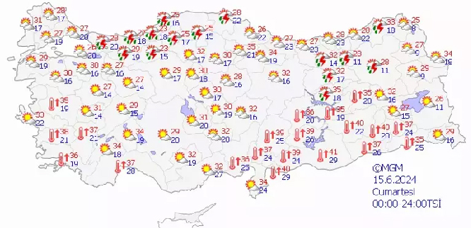 Meteoroloji Genel Müdürlüğü, 15 Haziran 2024 Cumartesi günü için hava durumu tahminlerini açıkladı.
