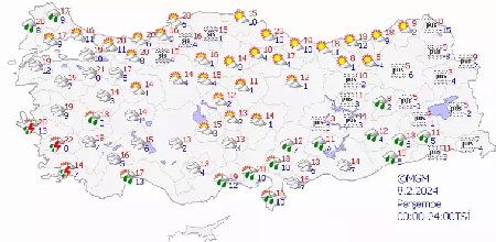 Meteoroloji’nin son tahminlerine göre, Türkiye'nin büyük bir bölümü parçalı ve çok bulutlu olacak. Kıyı Ege, Doğu Akdeniz, Güneydoğu Anadolu'nun kuzey ve doğusu ile Edirne, Kırklareli, Isparta ve Antalya çevrelerinde yağmur ve sağanak bekleniyor. İç ve doğu kesimlerde gece ve sabah pus, sis, buzlanma ve don olayı görülebilir. Doğu Karadeniz'in iç kesimleri ile Doğu Anadolu'nun kuzey ve doğusunda çığ riski bulunuyor.