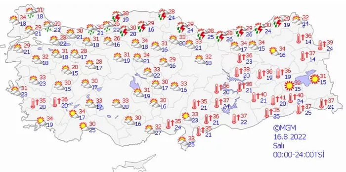 Ülkemizin kuzey, iç ve batı kesimlerinin parçalı yer yer çok bulutlu, Marmara, Kuzey Ege'nin iç kesimleri, Batı Karadeniz, Doğu Karadeniz kıyıları ile Eskişehir, Adana'nın kuzeyi, Osmaniye, Kahramanmaraş, Hatay'ın kıyıları, Akdeniz'in Toroslar Mevkii ile Ankara ve Çankırı'nın kuzeybatı ilçelerinin yerel sağanak ve gök gürültülü sağanak yağışlı, diğer yerlerin az bulutlu ve açık geçeceği tahmin ediliyor.