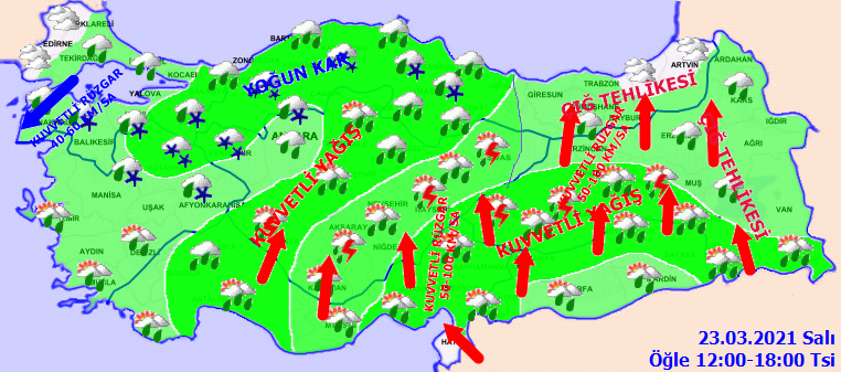 Meteoroloji Genel Müdürlüğü tarafından yapılan son değerlendirmelere göre; Ülkemiz genelinin çok bulutlu ve aralıklı yağışlı geçeceği tahmin ediliyor. Yağışların; yağmur ve sağanak, Akdeniz ile iç ve doğu bölgelerde yer yer gök gürültülü sağanak, zamanla Marmara’nın güneydoğusu, İç Ege, İç Anadolu'nun kuzey ve batısı ile Batı ve Orta Karadeniz’in iç kesimlerinde karla karışık yağmur ve kar şeklinde olması bekleniyor. Yağışların Marmara’nın güney ve doğusu, Ege, Akdeniz, İç Anadolu, Batı ve Orta Karadeniz, Doğu Karadeniz'in iç kesimleri, Doğu Anadolu'nun kuzey ve batısı ile Güneydoğu Anadolu’nun kuzeyinde kuvvetli, Doğu Anadolu’nun güneyi, Antalya’nın iç kesimleri ile Kahramanmaraş çevrelerinde yer yer şiddetli yağış şeklinde olacağı tahmin ediliyor.