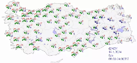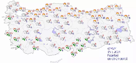 Haftanın ilk iş günü için plan yapacaklar tarafından 15 Ocak 2024 Pazartesi hava durumu tahminleri sorgulanıyor. Yapılan son değerlendirmelere göre: Ülkemiz genelinin parçalı ve yer yer çok bulutlu, Marmara'nın batısı, Güney ve Kıyı Ege. Akdeniz bölgesi ile Gaziantep, Adıyaman ve Kilis çevrelerinin yağışlı geçeceği tahmin ediliyor. Gece saatlerinde Kıyı Ege, Çanakkale'nin güney, Balıkesir'in batı kıyı kesimleri ile Antalya'nın batı ilçelerinde yer yer kuvvetli olması beklenen yağışların, genellikle yağmur ve sağanak, Toroslar Mevkii'nde karla karışık yağmur ve yer yer kar yağışı şeklinde olacağı tahmin ediliyor. Yurdun iç ve doğu kesimlerinde pus ve yer yer sis hadisesi bekleniyor. Doğu Karadeniz’in iç kesimleri ile Doğu Anadolu’nun kuzey ve doğusunda çığ tehlikesi bulunmaktadır.