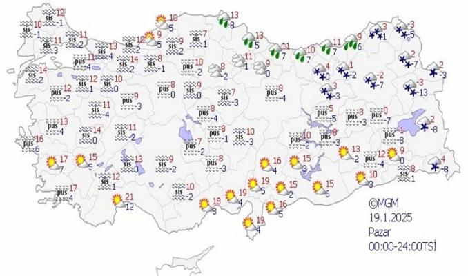 Meteoroloji Genel Müdürlüğü tarafından yapılan son tahminlere göre: kuzey ve doğu kesimlerinin parçalı ve çok bulutlu, Orta ve Doğu Karadeniz kıyıları ile Kastamonu’nun kuzeyi ve Sinop çevrelerinin yağmurlu, Doğu Karadeniz’in iç kesimleri ile Doğu Anadolu’nun kuzey ve doğu kesimlerinin karla karışık yağmur ve kar yağışlı, diğer yerlerin az bulutlu ve açık geçeceği tahmin ediliyor.