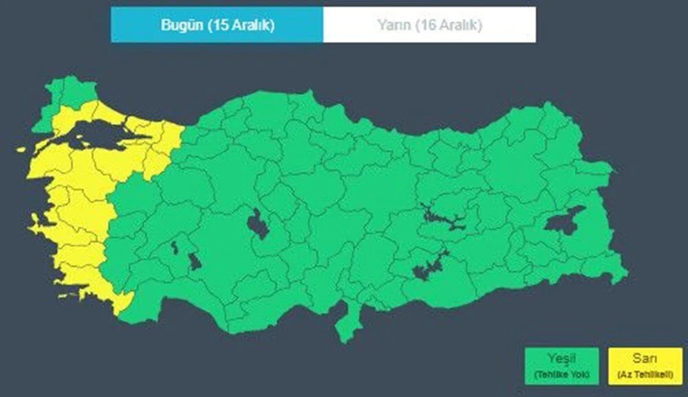 MGM tarafından Aydın, Balıkesir, Bilecik, Bursa, Çanakkale, İstanbul, İzmir, Kocaeli, Manisa, Muğla, Sakarya, Tekirdağ ve Yalova için sarı kodlu kuvvetli yağış uyarısı yapıldı.