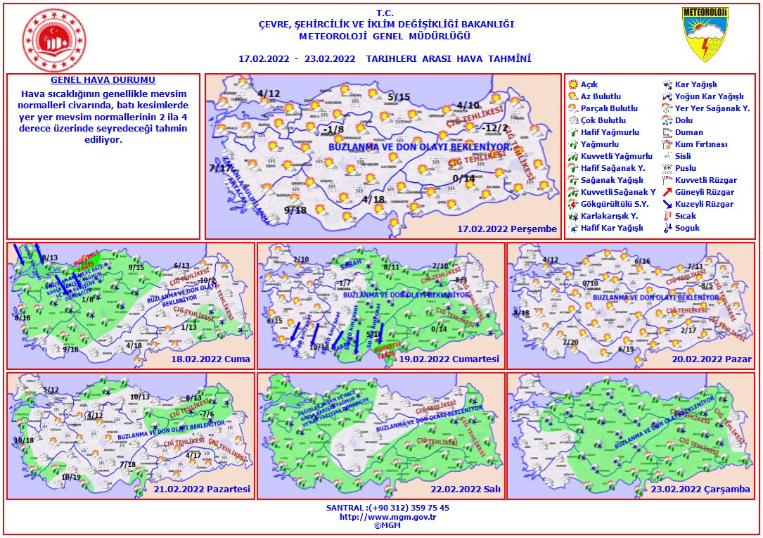 Meteoroloji Genel Müdürlüğü, 16-20 Şubat tarihlerini kapsayan hava durumu tahmin raporunu sosyal medyadan yayımladı.