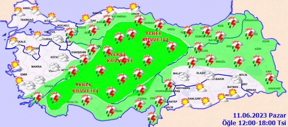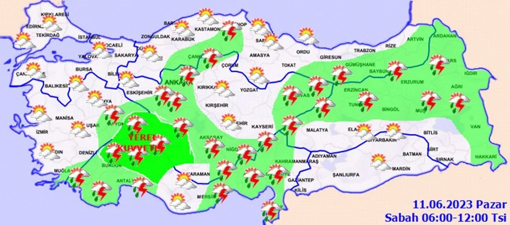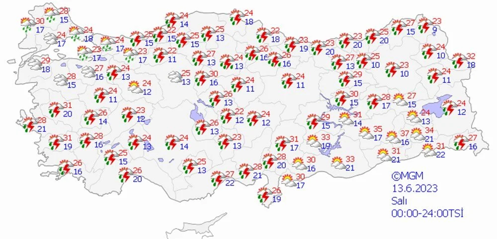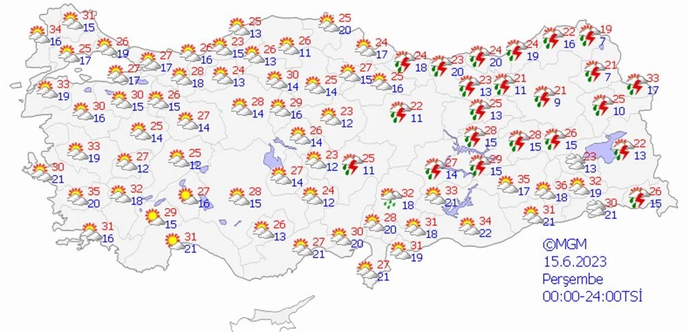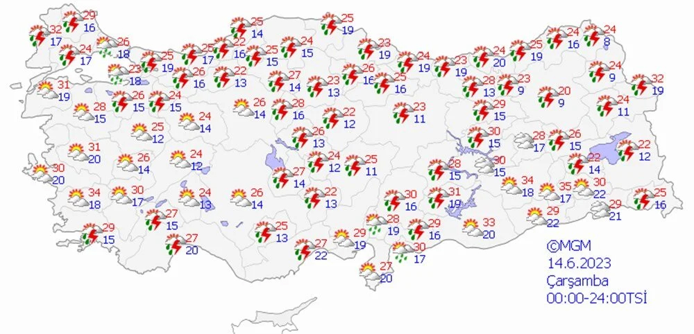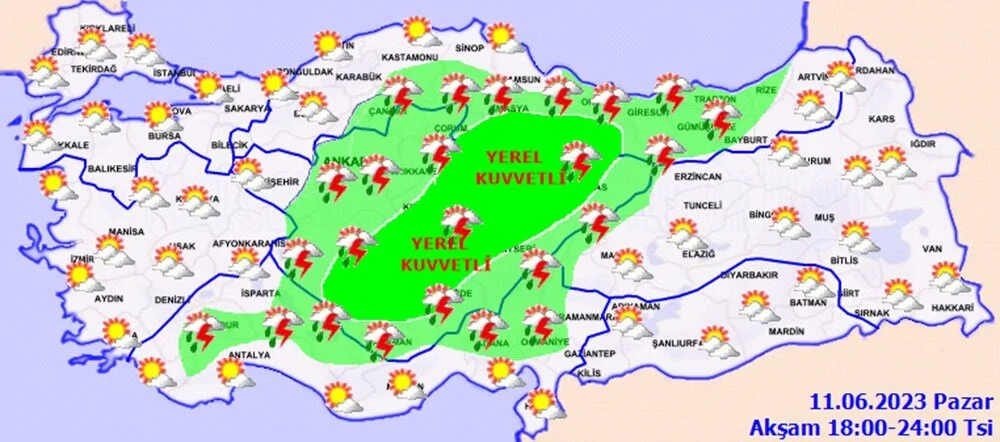 Meteoroloji Genel Müdürlüğü tarafından yapılan son değerlendirmelere göre: Ülke geneli parçalı ve çok bulutlu, Akdeniz, İç Anadolu (Eskişehir hariç), Batı Karadeniz'in iç kesimleri, Orta ve Doğu Karadeniz, Doğu Anadolu’nun kuzey ve doğusu ile Afyonkarahisar, Denizli, Muğla ve Sakarya çevrelerinin sağanak ve gök gürültülü sağanak yağışlı geçeceği tahmin ediliyor.