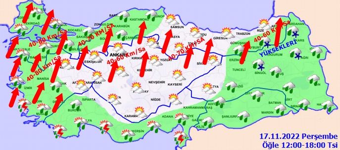 Rüzgarın; Marmara, Ege, Batı ve Orta Karadeniz Bölgeleri ile İç Anadolu'nun kuzeyi ve Doğu Karadeniz'in iç kesimlerinde güney yönlerden kuvvetli (40-60 km/sa), Marmara ve Kuzey Ege'de zaman zaman kısa süreli fırtına (70-80 km/sa) şeklinde eseceği tahmin edildiğinden yaşanabilecek olumsuzluklara karşı dikkatli ve tedbirli olunmalıdır.