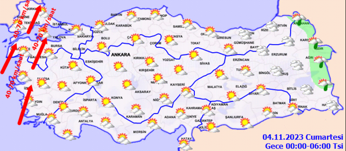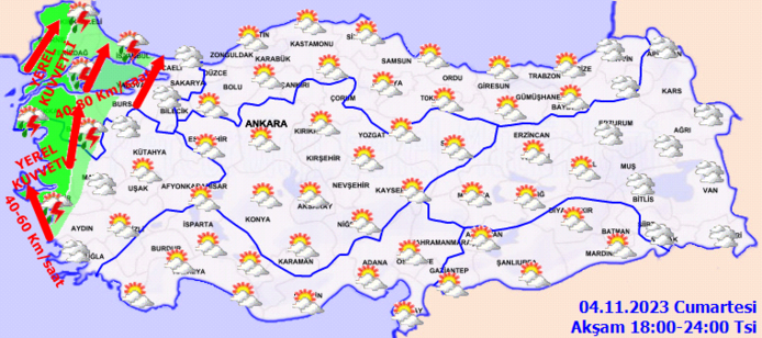 Trakya Kesimi ile Çanakkale çevrelerinde yer yer kısa süreli kuvvetli ve tam fırtına (80-100 km/saat) şeklinde esmesi beklendiğinden ağaç ve direk devrilmesi, çatı uçması ve ulaşımda aksamalar gibi olumsuzluklara karşı dikkatli ve tedbirli olunması gerekmektedir.