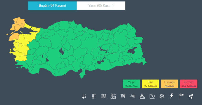 Meteoroloji; Kırklareli, Edirne, Tekirdağ ile Çanakkale için "turuncu", İstanbul, Kocaeli, Bursa, Yalova, Balıkesir, İzmir, Manisa ve Aydın için "sarı" alarm uyarısında bulundu.