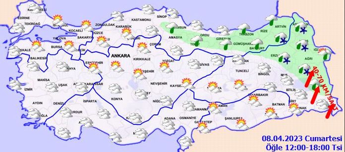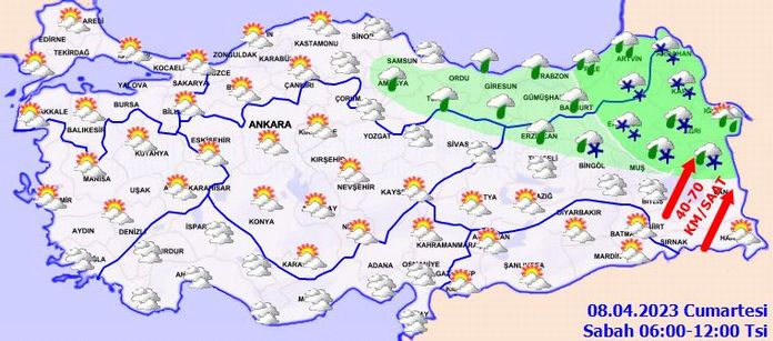 Yağışların, genellikle yağmur ve sağanak, Doğu Karadeniz’in iç kesimlerinin yüksekleri ile Doğu Anadolu’nun kuzeydoğusunda karla karışık yağmur ve yer yer kar şeklinde görülmesi bekleniyor.