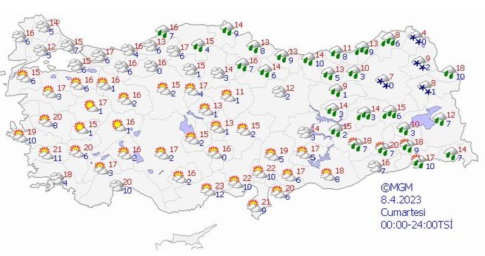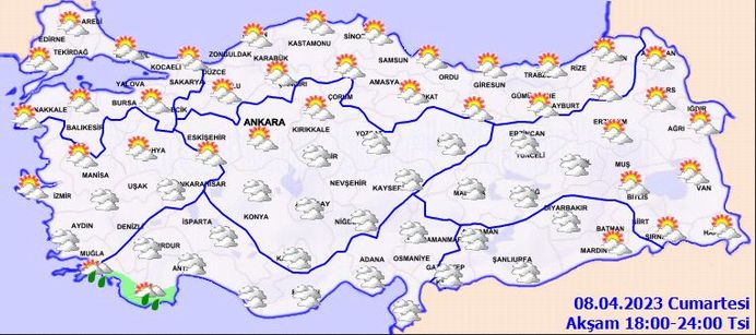 Meteoroloji Genel Müdürlüğü'nün son tahinlerine göre ülkemiz genelinin parçalı ve çok bulutlu, Göller Yöresi, Doğu Karadeniz, Doğu Anadolu'nun kuzeyi ile Aydın, Muğla, Denizli, Mersin, Adana, Niğde, Amasya, Tokat ve Ordu çevrelerinin yağışlı geçeceği tahmin ediliyor.