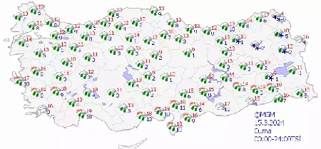 Meteoroloji Genel Müdürlüğü tarafından 15 Mart hava durumu tahminleri açıklandı. Yapılan son tahminlere göre; ülkemiz genelinin parçalı ve çok bulutlu, Muğla, Ş.Urfa, Van ve Iğdır çevreleri dışında kalan yerlerin yağışlı geçeceği tahmin ediliyor. Genellikle yağmur ve sağanak, Doğu Karadeniz'in iç kesimleri ile Doğu Anadolu'nun doğusunun yükseklerinde karla karışık yağmur ve yer yer kar şeklinde görülecek.