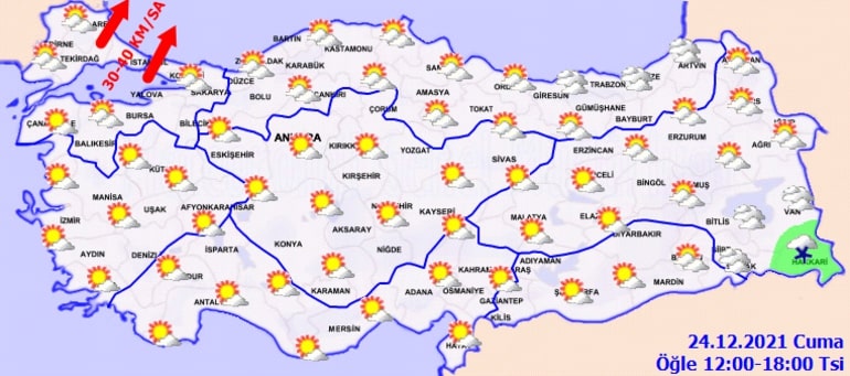 Meteoroloji Genel Müdürlüğü tarafından yapılan son değerlendirmelere göre: Yurdun kuzey ve doğu kesimlerinin parçalı ve yer yer çok bulutlu, Rize, Batman, Siirt, Bitlis, Van ve Hakkari çevrelerinin karla karışık yağmur ve kar yağışlı, diğer yerlerin az bulutlu geçeceği tahmin ediliyor. İç ve doğu kesimlerde buzlanma ve don ile birlikte yer yer pus ve sis hadisesi bekleniyor.