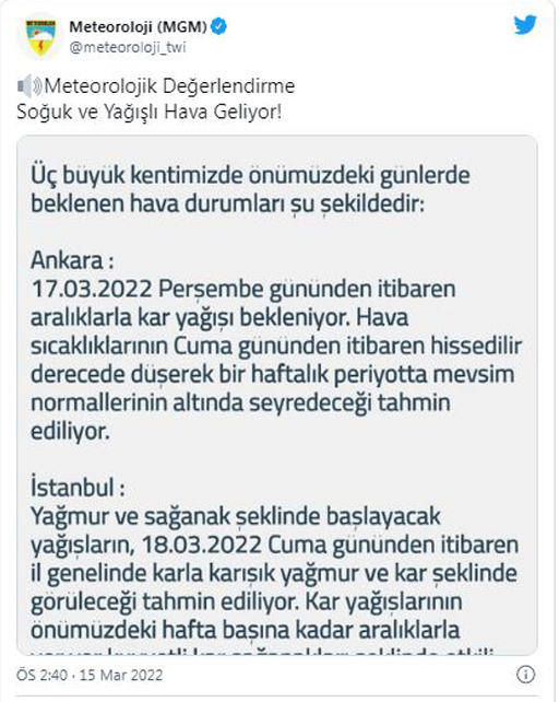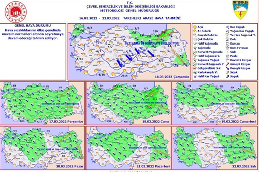 MGM tarafından yayınlanan uyarıda 17 Mart perşembe gününden itibaren ülke genelinin soğuk ve yağışlı havanın etkisi altına girmesi bekleniyor. Perşembe günü genellikle yağmur ve sağanak, iç ve doğu kesimlerde karla karışık yağmur ve kar şeklinde başlayacak yağışların 18 Mart Cuma gününden itibaren güney kesimler hariç yurt genelinde kar şeklinde görülmesi bekleniyor.
