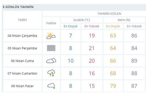 Meteoroloji Genel Müdürlüğü tarafından yapılan hava durumu tahminlerine göre İstanbullular 5 gün içinde güneş, yağmur ve pus hadiselerin yaşayacak. 4 Nisan Çarşamba günü güneşli ve az bulutlu bir hava yaşanacak. 5 Nisan Perşembe günü pus hadisesi görülecek. 6 Nisan Cuma günü se çok bulutlu bir hava görülecek. 7 Nisan itibariyle de İstanbul'da kuvvetli yağışlar görülecek.