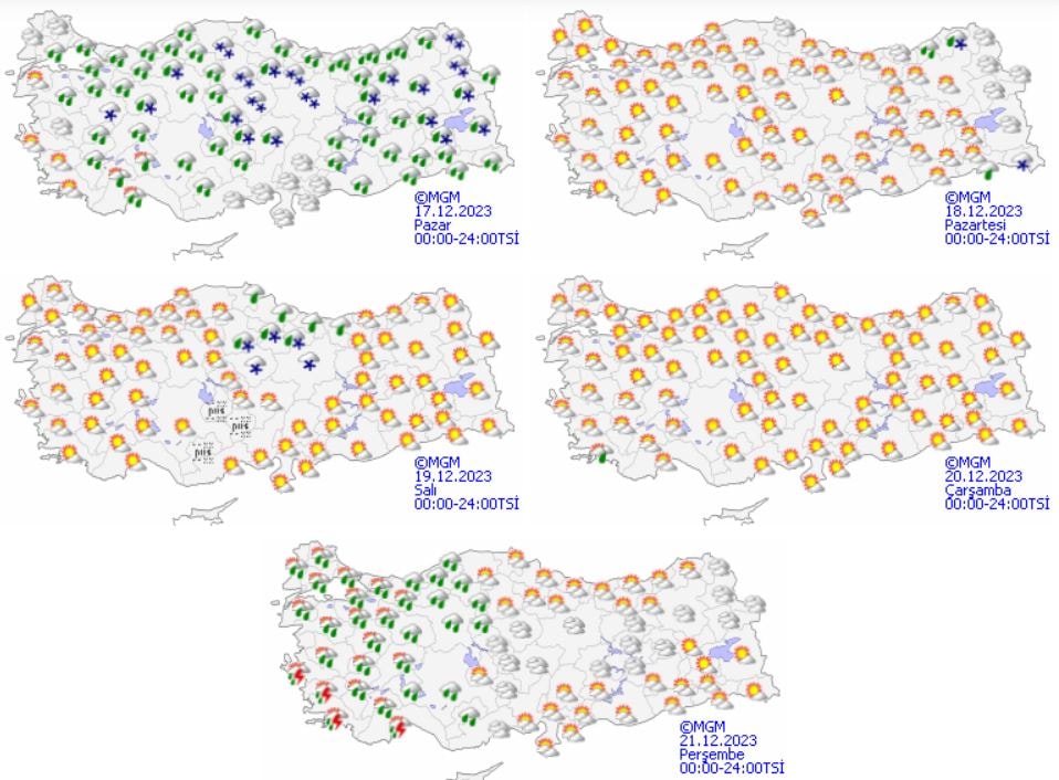 Genellikle yağmur ve sağanak, Karadeniz'in iç kesimleri, Doğu Anadolu'nun doğusu, Bilecik, Kütahya, Eskişehir, Bursa'nın yüksekleri ile Ankara ve Sivas'ın kuzey ilçelerinde karla karışık yağmur ve kar şeklinde görülmesi beklenen yağışların; bu akşam ilk saatler Marmara, Kıyı Ege ve Antalya çevrelerinde kuvvetli, Antalya’nın doğu ilçelerinde çok kuvvetli, gece saatlerinden itibaren Doğu Karadeniz kıyılarında kuvvetli, Rize ve Artvin çevrelerinde çok kuvvetli yağmur, yükseklerinde yoğun kar olması bekleniyor. Gece ve sabah saatlerinde iç ve doğu kesimlerde yer yer pus ve sis bekleniyor.