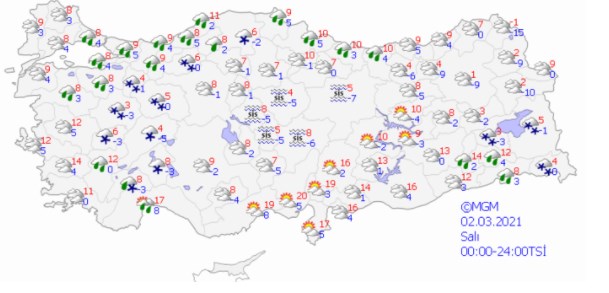Meteoroloji Genel Müdürlüğü tarafından yapılan son hava durumu değerlendirmelerine göre, kuzey, iç ve doğu kesimlerinin parçalı çok bulutlu, Marmara'nın güney ve doğusu, İç Ege, Batı Akdeniz, Batı Karadeniz, Orta Karadeniz kıyıları, Doğu Anadolu'nun güneydoğusu Kırklareli, Tekirdağ, Giresun, Kars, Ağrı, Iğdır, Diyarbakır, Batman, Siirt çevreleri, Ankara'nın kuzey ve batısı, Erzurum'un güney kesimlerinin yağışlı diğer yerlerinin az bulutlu geçeceği tahmin ediliyor. Yağışların kıyılar ve Güneydoğu Anadolu'da yağmur, diğer yerlerde karla karışık yağmur ve kar şeklinde olması bekleniyor.